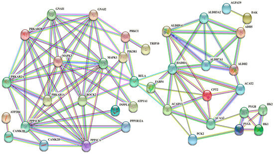 Most DEPs in the protein interaction network have strong interaction relationships (Figure 7), such as the fatty acid metabolism-related proteins ALDH9A1, ALDH7A1, ALDH3A2, ALDH2, HADHA, ACAA2, and ACAT2. Extremely long-chain specific acyl-CoA dehydrogenase (ACADVL) was strongly correlated with potential fatty acid synthesis-related proteins such as RELA, MAPK1, MAPK3, PIK3R1, and PABP4. Additionally, the phosphorylation-related proteins ROCK2, MAPK1, MAPK3, PPP1CA, PPP1CB, and PPP1R12A had strong interactions with the signal transduction guanosine binding proteins GNAI1 and GNAI2 and the protein kinases PRKAR2A and PRKAR2B. Moreover, certain proteins, including AGPAT9, DK2, TRIP10, and ATP2B4, were located at the periphery of the interaction network.