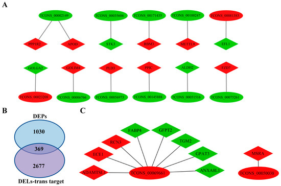 Figure 8. lncRNA–protein regulatory network. (A) DEL-DEP (lnRNA cis-target) interaction network. (B) Intersection of DEL trans-targets and proteomic DEPs. (C) DEL-DEP (lnRNA trans-target) interaction network. Ovals represent differentially expressed lncRNAs; diamonds represent differentially expressed proteins; red represents differential upregulation; green represents differential downregulation.