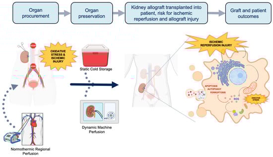 The current demand for kidney grafts for transplantation far outweighs the supply. Thus, it is imperative to innovate new ways to increase the deceased donor pool. Grafts from less ideal donors such as extended criteria donors (ECDs) and donation after circulatory death (DCD) are viable options to help address the demand. However, these higher risk grafts are more vulnerable to greater degrees of ischemic reperfusion injury (IRI) and oxidative stress due to differences in metabolic demand. During the process of organ procurement, preservation, and transplantation, allografts accumulate a series of physiologic insults that are paradoxically exacerbated at the time of organ reperfusion (Figure 1). The first insult occurs during organ procurement when blood flow to the organ is discontinued, when cells transition from aerobic to anaerobic metabolism [6].The altered physiology under prolonged ischemic conditions [7] leads to oxidative stress, decreased adenosine triphosphate (ATP) production, and accumulation of intracellular lactate. Uncompensated acidosis ensues with a subsequent imbalance of electrolytes and cellular swelling. Upon restoration of blood flow at the completion of transplantation, although oxygen availability and acidosis are normalized, a second insult occurs. Intracellular proteinases, permeability of the mitochondrial membrane, and generation of reactive oxygen species (ROS) are activated leading to further oxidative stress and cell injury [8]. Paradoxically, the sum-total effect of these processes leads to cellular necrosis and programmed cell death from activation of apoptotic, ferroptotic, and autophagy pathways. Therefore, a key aspect of expanding the donor pool relies on innovative organ preservation techniques to reduce IRI.