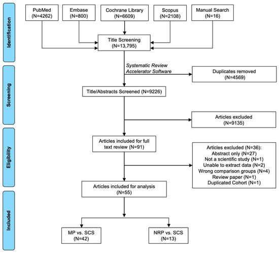 A total of 13,794 articles were identified through database retrieval. After removing duplicates (N = 4569 articles) and screening titles/abstracts (N = 9225 articles), 90 articles were included for full-text review. Of these, 36 did not meet the selection criteria and were excluded. In total, there were 55 manuscripts included (N = 42 MP vs. SCS articles [9,15,17,20,21,22,23,24,25,26,27,28,29,30,31,32,33,34,35,36,37,38,39,40,41,42,43,44,45,46,47,48,49,50,51,52,53,54,55,56,57]; N = 13 NRP vs. ISP articles [58,59,60,61,62,63,64,65,66,67,68,69,70]) (Figure 2).