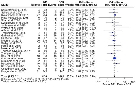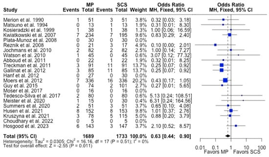 Pooled categorical data were presented as percentages, while continuous variables were presented with means, each with their corresponding 95% confidence interval (95%CI), respectively. Missing means and standard deviations were estimated by the sample size, median, interquartile range, and range as previously published [18,19]. Studies with reported means and medians but without other components for analysis were not included in the final analysis but were maintained in the dataset and forest plots for completeness. Only studies where MP and NRP were compared to SCS and ISP, respectively, were included. A common effect model (or fixed-effect method) was used for the analysis of more statistically homogenous data (I2 < 50%), while a random effect model was used to analyze and present data for more heterogenous data (I2 > 50%). Both common effect and random effect models were generated for each outcome as sensitivity analyses to ensure there were no significant differences. The Mantel–Haenszel approach was used to analyze categorical data, while a standard inverse variance approach was used for continuous data. Meta-analyses of continuous and categorical variables were represented by their mean difference (MD) or odds ratio (OR) with their respective 95%CI. An alpha level of <0.05 was considered to be statistically significant. Data processing and analysis were performed using R studio (version 4.2.2; Vienna, Austria).