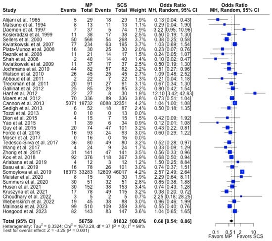 Forest plot for rates of DGF between MP and SCS [9,15,17,20,22,23,24,25,26,27,28,29,30,31,32,33,34,35,36,37,38,39,40,41,42,43,44,45,46,47,48,49,51,52,53,54,55,56,57,71].