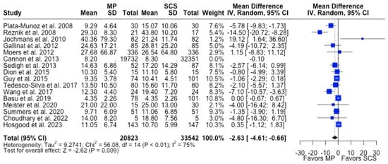 Forest plot for mean of length of hospital stay between MP and SCS [15,27,28,31,34,36,37,38,39,40,44,45,49,51,52,57].
