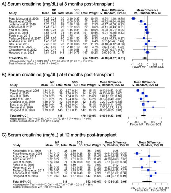 There were fewer studies that assessed graft function through biomarkers such as serum creatinine (29.3%) and eGFR (24.4%). MP and SCS grafts had comparable serum creatinine levels at 3 months (1.74 mg/dL vs. 1.90 mg/dL, p = 0.063), 6 months (1.67 mg/dL vs. 1.70 mg/dL, p = 0.226), and 12 months (1.58 mg/dL vs. 1.66 mg/dL, p = 0.278) post-transplant. Likewise, eGFR at all post-transplant time points were similar between MP and SCS (p > 0.05) (Table 1) (Figure 7).