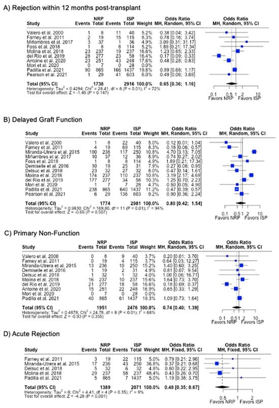 Forest plot for rates (A) acute rejection, (B) delayed graft function, (C) primary non-function, (C) acute rejection, and (D) graft failure within 12 months post-transplant between NRP and ISP [58,59,60,61,62,63,64,65,66,67,68,69,70].