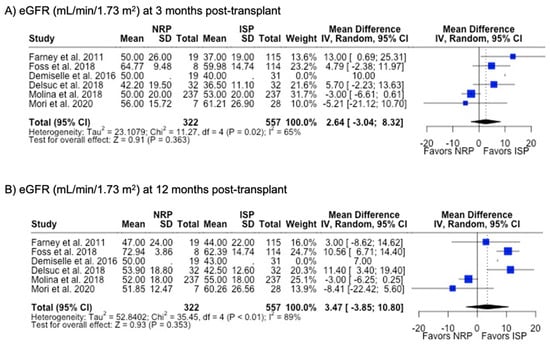 Forest plot for post-transplant eGFR (mL/min/1.73 m2) at (A) 3 months and (B) 12 months between NRP and ISP [59,62,63,64,66,67].