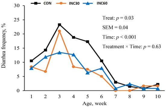 Nevertheless, within the domain of calf health, a substantial disparity in the frequency of diarrhea was conspicuously evident. Specifically, the diarrhea frequency of calves of dams showed a linear decrease as the INC level increased, as illustrated in Figure 1 (10.9% vs. 6.12% vs. 6.08%, p = 0.03). Notably, calf rectal body temperature remained consistent and uniform among all treatment groups during each assessment period.