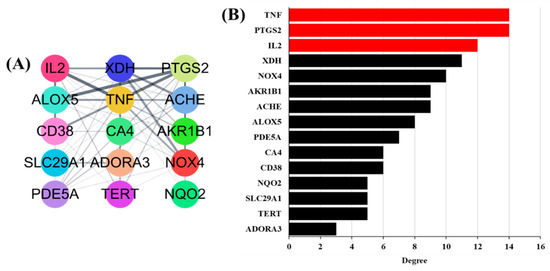 Potential antioxidant targets of PPI network: (A) Top 15 genes selected based on compounds. The thicker the line connecting each node, the higher the correlation. (B) Top 15 potential antioxidants targets ranked by degree values.
