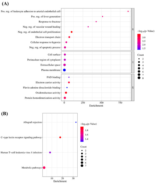 To verify the GO findings for the 15 highlighted targets of GLs, GO enrichment analysis of putative targets was performed and identified ‘biological processes’ (p < 0.001), ‘cellular composition’ (p < 0.05), and ‘cell composition’ (p < 0.05), as shown in Figure 5A,B. ‘Molecular function’ (p < 0.05) and ‘migration route’ (p < 0.05) were clarified. The y-axis represents the GO terms and the x-axis represents the number of genes enriched in those terms. Colors from blue to red represent p values. The size of the symbols decreases as the number of enriched genes increases in reliability and importance. We selected the top terms based on p-value. Enriched ‘biological processes’ included ‘negative regulation of endothelial cell proliferation’, ‘positive regulation of leukocyte adhesion to arterial endothelial cells’, ‘fever generation’, ‘response to fructose’, ‘negative regulation of the apoptotic process’, and ‘negative regulation of vascular wound healing’. ‘Cellular component enhancement included ‘cell surface’, ‘perinuclear region of cytoplasm’, ‘extracellular space’, and ‘plasma membrane’. ‘Molecular feature’ enrichment included, ’electron carrier activity’, ‘flavin adenine dinucleotide binding’, ‘oxidoreductase activity’, and ‘protein homodimerization activity’, suggesting this association. Based on their p-values, ‘allograft rejection’ (hsa05330), ‘C-type lectin receptor signaling’ (hsa04625), ‘human T-cell leukemia virus 1 infection’ (hsa05166), and ‘metabolic’ (hsa01100) were selected as the antioxidant pathways influenced by GLs.