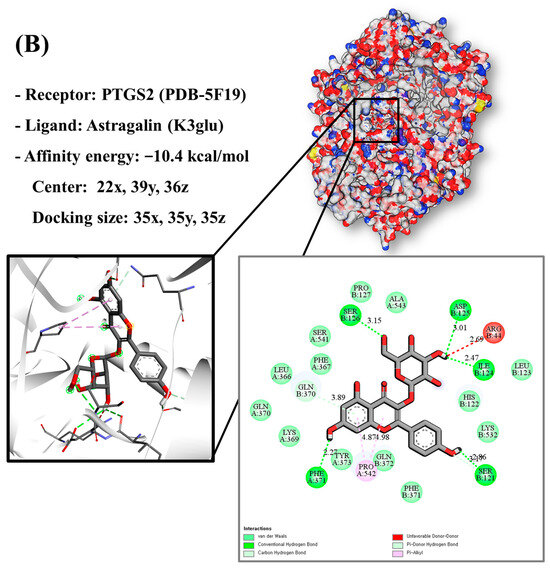 Molecular docking analysis utilizes molecular modeling techniques to predict how proteins will interact with small molecules. In this study, molecular docking of three top-selected genes and bioactive compounds was performed. When identifying antioxidant-related genes, K3glu (the flavonoid astragalin, found in various plant parts) was selected as the representative antioxidant compound of GLs based on the probability (% and n number) of homologous genes. Astragalin has been reported to have anti-inflammatory, antioxidant, and anti-atopic dermatitis properties [47,48]. Astragalin can attenuate lipopolysaccharide (LPS)-induced inflammatory responses by inhibiting the NF-κB signaling pathway [49,50]. By convention, the binding capacity between the tested molecule and the protein in the molecular docking analysis was expressed as affinity. The affinities of the selected genes and bioactive compounds were calculated as −7.8 kcal/mol for TNF, −10.4 kcal/mol for PTGS2, and −9.5 kcal/mol for IL2 (Figure 7A–C). The docking results indicated that the receptor-ligand interactions between the candidate bioactive compounds in GLs and proteins involved hydrophobic and polar interactions: TNF in ASN-92 and SER-95; PTGS2 in SER-126, ASP-125, ILE-124, PHE-371, and SER-121; and IL2 can form hydrogen bonds in SER-126, ASP-125, ILE-124, PHE-371, and SER-121.