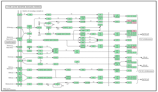 The C-type lectin receptor signaling pathway (Figure 8), which was judged to have high significance (p-value) based on the graph results in Figure 3B, was selected as the antioxidant transport pathway influenced by GLs. Flavonoid compounds detected in GLs regulate the expression of TNF and IL2 cytokines by regulating the activation of T helper 1 and 17 (Th1 and Th17) cells. This regulation plays an important role in a variety of immune and inflammatory responses. For example, quercetin is known to inhibit the expression of TNF-α and IFN-γ in Th1 cells, which may help reduce inflammation in autoimmune and inflammatory diseases [51]. Quercetin may also reduce the production of Th17-related cytokines, such as IL17 and IL22, and increase the production of Th1-related cytokines, such as IFN-γ [52,53]. We postulate that the anti-inflammatory and immunomodulatory effects of flavonoid compounds in GLs may be useful in prevention and treatment strategies for several diseases, such as chronic inflammatory diseases, autoimmune diseases, and cancer. This interpretation indicates that a single flavonoid compound in GLs exerts antioxidant effects in multiple genes that can be targeted simultaneously.