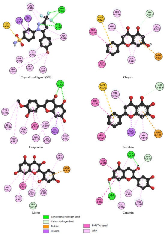Upon closer examination, the binding sites and interaction patterns of the crystallized ligand S58 and the flavonoid derivatives (chrysin, hesperetin, baicalein, morin, and catechin) with COX-2 were notably distinct due to their unique structural features. The crystallized ligand S58, characterized by its sulfonamide, trifluoromethyl, and phenyl groups, forms specific interactions with key residues such as Arg120 and Tyr355 through hydrogen bonds and hydrophobic contacts, contributing to its high binding affinity. In contrast, the flavonoid chrysin, with its hydroxyl groups on the A ring, primarily interacts with Ser353 via hydrogen bonding and engages in hydrophobic interactions with residues like Leu352 and Val523.