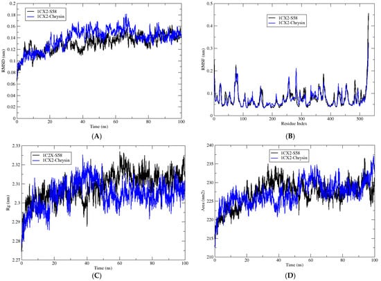 MD simulations were performed utilizing the NAMD 2.14 package [] to evaluate the stability of docking complexes comprising the top-ranked bioactive ligand, chrysin, alongside the co-crystallized inhibitor S58 with the COX-2 enzyme. Topology data for the ligands were automatically generated through the CHARMM-GUI server employing the charmm36 force field []. Solvation and neutralization of the systems were accomplished using the TIP3P water model, supplemented with Na+ and Cl− ions. The stimulation protocol commenced with 5000 steps of energy minimization, followed by an equilibration phase under constant volume and temperature (NVT). Subsequently, a production phase of 100 ns at a time step of 2 fs was conducted under constant temperature and pressure of 300 K (NPT). The analysis of simulation trajectories encompassed the root mean square deviation (RMSD), root mean square fluctuations (RMSF), the radius of gyration (Rg), solvent accessible surface area (SASA), and hydrogen bond count. The g_mmpbsa tool was used to assess the binding free energies of the enzyme–ligand complexes []. The MMPBSA analysis was performed for the last 5 ns of the MD trajectory for each enzyme–ligand complex.