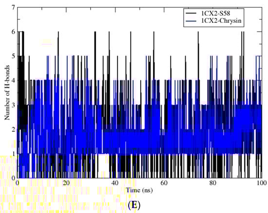 (A) RMSD of the complexes 1CX2-S58 and 1CX2-Chrysin observed during 100 ns MD simulation. (B) RMSF of the complexes 1CX2-S58 and 1CX2-Chrysin during 100 ns MD simulation. (C) The radius of gyration of the complexes 1CX2-S58 and 1CX2-Chrysin during 100 ns MD simulation. (D) SASA of the complexes 1CX2-S58 and 1CX2-Chrysin observed during 100 ns MD simulation. (E) Number of H-bonds of the two complexes 1CX2-S58 and 1CX2-Chrysin during 100 ns MD simulation.