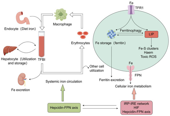 The regulation and the association between systemic iron circulation and cellular iron metabolism. Systemic and cellular iron are tightly regulated. Dietary iron is the only source of exogenous iron used to replace iron lost through iron excretion or bleeding. Dietary iron is absorbed into the bloodstream by enterocytes and exists in the circulation mainly as TFBI, which is recognized and taken up for use by cells of various tissues via TFR1. The liver is primarily responsible for systemic iron storage and regulates systemic iron homeostasis by synthesizing hepcidin. In the plasma, macrophages phagocytose senescent erythrocytes, releasing iron from hemoglobin and re-entering the circulation. Intracellularly, iron in the LIP is available for the synthesis of substances, such as the synthesis of heme by red lineage cells and the synthesis of Fe-S clusters by cells of various tissues, while excess iron is stored in ferritin. Ferritin can release the stored iron into the LIP via ferritinophagy, and intracellular iron can also be excreted directly from the cell via the FPN or by secretion of ferritin. When the intracellular iron regulation mechanism fails or the cellular iron is overloaded, the iron in LIP can generate toxic ROS through the Fenton reaction, leading to oxidative stress and cellular damage. Abbreviation: TFBI: transferrin bound iron, FPN: ferroportin, LIP: labile iron pool, HIF: hypoxia-inducible factor, IRP-IRE: iron-regulatory protein and iron-responsive element.
