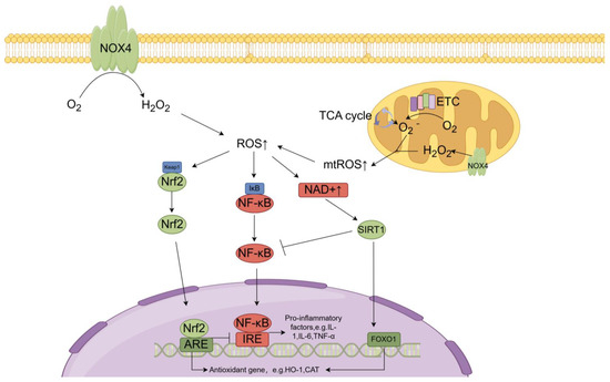 The seven mammalian sirtuins (SIRT1-7) regulate various processes related to antioxidant capacity, oxidative stress and metabolism. SIRT1, the most extensively characterized isoform, localizes to the cytoplasm and nucleus [280]. As a NAD+-dependent deacetylase, SIRT1 helps maintain redox homeostasis by modulating the ratio of NAD+/NADH [281,282,283]. SIRT1 inhibits inflammatory responses and oxidative stress by deacetylating the p65 subunit of NF-κB [284]. In human renal tubular epithelial cells (HK-2) cultured with high glucose, SIRT1 deacetylation activity is decreased, resulting in a decrease of p65 deacetylation and then an increase of NF-κB activity, which decrease the expression of miR-29 through directly binding to its promoter. MiR-29 has an ability to target and suppress Keap1 gene expression. The decrease of miR-29 increases Keap1 expression and inhibits the Nrf2/ARE (antioxidant response element) pathway [285]. SIRT1 also promotes the activation of endothelial NOS in rats, leading to more NO production and preventing oxidative stress [286]. FOXO1 and FOXO3 regulate antioxidant genes like SOD2 and CAT through SIRT1-mediated deacetylation [287]. By modifying the transcription of the FoxO target gene, SIRT1 protects diabetic kidneys and blood vessels from oxidative stress and tissue damage [287]. In addition, SIRT1 inhibits p53-dependent apoptosis arising from DNA damage and oxidative stress through p53 deacetylation, promoting human renal cell survival [288]. SIRT1 also negatively regulates the mitochondrial ROS producer p66Shc by promoting its deacetylation, reducing oxidative stress and maintaining mammalian endothelial function [289].