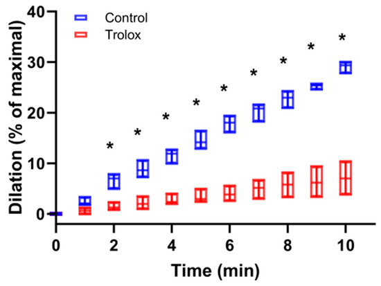 Antioxidant Trolox attenuates ex vivo vasodilation. Facialis arteries from C67BI/6 mice were isolated and pressurized before constriction. Red light (670 nm, 6 J/cm2) was applied in the absence and presence of Vitamin E derivative Trolox (200 µM). Dilation was assessed with pressure myography and expressed as a percentage of maximal dilation. The Trolox-dependent decrease was significant from t = 2 min with * p < 0.05 by using a paired Student’s t test. N = 6.
