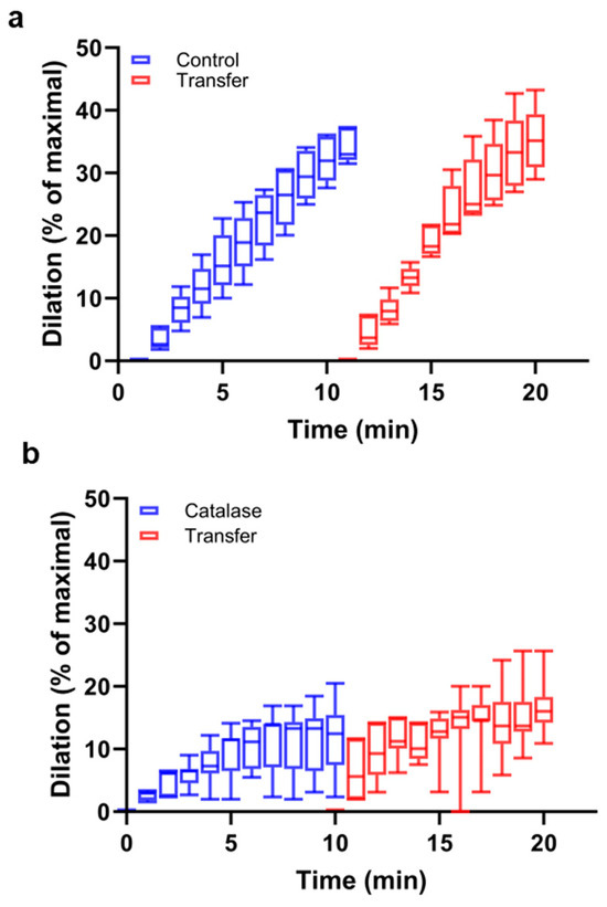 Further, we tested whether the antioxidant enzyme catalase, which protects cells from oxidative stress by converting H2O2, the precursor of hydroxyl radical, to H2O would act similarly to Trolox. Indeed, catalase pretreatment (100 U/mL) resulted in a reduction of dilation from 34.3% (Figure 2a, blue) to 12.0% (Figure 2b, blue) in 10 min. Again, the difference was significant at all measured time points starting from 2 min. To test whether the antioxidant treatment would interefere with the production of a transferrable vasodilator, the bath buffer, after light exposure of the primary blood vessel, was transferred to a naïve artery in the presence and absence of catalase. As expected, the attenuating effect of catalase was transmittable to a naïve vessel, indicating the dilating effect was not weakend during transfer to the bath (Figure 2a, red and Figure 2b, red). This is consistent with our earlier findings [16] and suggests the formation and traffic of extracellular vesicles could be responsible for the observed vasodilation [17] and are regulated by the light-dependent generation of ROS. To test this hypothesis, the bath buffer after light treatment was collected and subsequently underwent particle testing with Nanoparticle Tracking Analysis after catalase pre-treatment (1.24 × 108 ± 8.23 × 106 particle/mL) as compared to the untreated control (4.15 × 108 ± 1.6 ×107 particle/mL). These results support a decrease in exosome concentration in the presence of catalase. The automated measurements provide the results as mean ± SD and do not compute significance, but the 3.3-fold drop with the tight error intervals suggest a remarkable difference (Figure 2c).