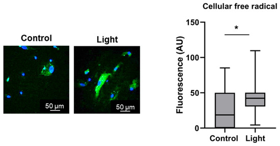 Red-light-mediated free radical formation. Free radicals were recognized with an anti-DMPO antibody. Endothelial cells (BAECs) were incubated with DMPO (100 mM, 1 h), then exposed to light (670 nm, 6 J/cm2). Free radicals were detected using an anti-DMPO antibody (green) and nuclei were stained with DAPI (blue). A significant fluorescence increase of intensity was detected after light exposure (* p < 0.05 by using a one-tailed unpaired Student’s t test). N = 15 slides.