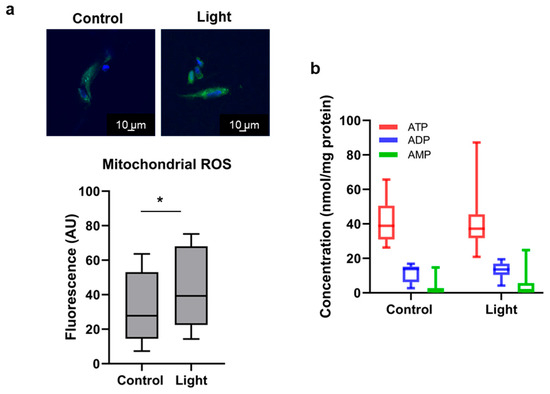 Effect of red-light mediated oxidative stress on mitochondria. BAECs were exposed to light (670 nm, 6 J/cm2) (a) Mitochondrial ROS was detected with MitoPy fluorescence (green). Light exposure resulted in significant increase (* p < 0.05). Nuclei were stained with DAPI (blue). N = 9 slides; (b) Changes in levels and distribution of adenine nucleotides were determined in cell lysate after HPLC separation. Between control and light, p > 0.05 and N = 13 for all ATP, ADP, and AMP. A one-tailed unpaired Student’s t test was used.