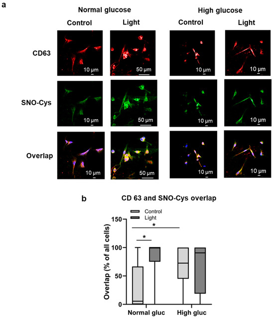 Effect of red light and glucose on the localization of vasodilatory substance. BAECs were pre-incubated with D-glucose (15 mM, overnight) and exposed to light (670 nm, 6 J/cm2). Co-localization of CD63 late exosome marker with S-nitrosoproteins (SNO-Cys) characterizes the accumulation of vasodilatory SNO-Cys in the late exosomes. (a) Representative images. CD63 is labeled as red and SNO-Cys as green. Nuclei were stained with DAPI (blue); (b) quantification of the overlap between CD63 and SNO-Cys (* p < 0.05 by using a one-tailed unpaired Student’s t test). N = 6 slides.