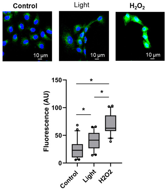 Comparison between the effects of mild (red light) and strong (H2O2) oxidative stress on exocytosis-regulating membrane protein Rab11. Endothelial cells were exposed to light (670 nm, 6 J/cm2), or treated with H2O2 (100 µM, 1 h). Rab11 levels were detected with immunofluorescence using the corresponding antibodies (green). Significantly higher intensities were recorded with H2O2 vs. light exposure (* p < 0.05 by using a one-tailed unpaired Student’s t test). Nuclei were stained with DAPI (blue). N = 12 slides.
