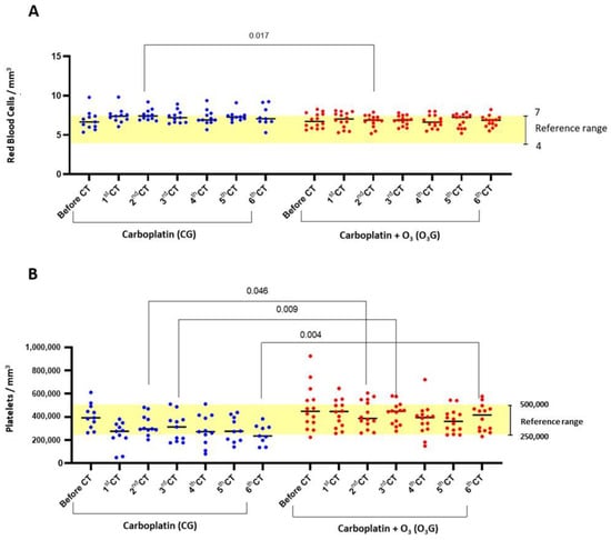 Comparison of red blood cell and platelet counts throughout the chemotherapy treatment of the animals from the control and ozone groups. (A) Total red blood cells; (B) platelets. The one-way ANOVA statistical test was used, with significance at p < 0.05.