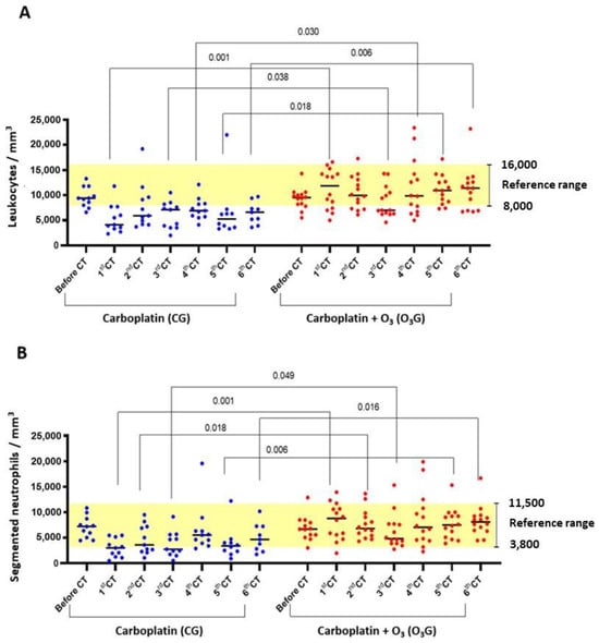 Comparison of total leukocyte and neutrophil counts throughout the chemotherapy treatment. (A) Total leukocytes; (B) neutrophil granulocytes (segmented neutrophils). The one-way ANOVA statistical test was used, with significance at p < 0.05.
