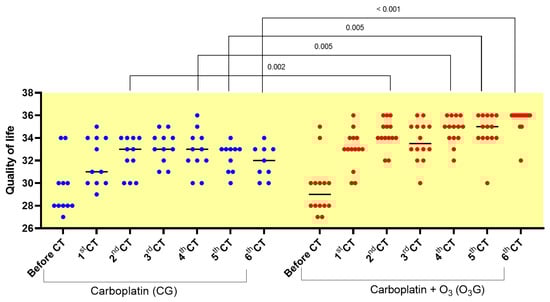 An increase in the quality of life was observed between the two treatment groups, with greater evidence and significance in the O3G when compared to the CG in the second (p = 0.002), fourth (p = 0.005), fifth (p = 0.005), and sixth (p < 0.001) CT sessions (Figure 4).