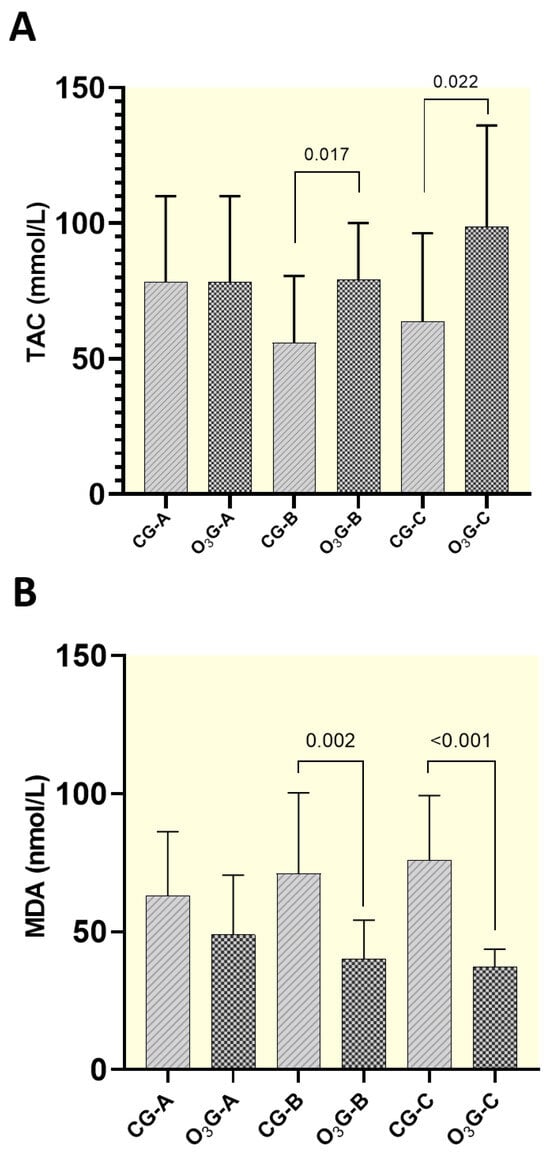 The mean serum concentrations of total antioxidant capacity (TAC) (mmol/L) between the CG and O3G were significantly different (p < 0.05). There was no significant difference between the groups in moment A (start of treatment—before the first chemotherapy session). However, at moment B (middle of treatment—moments before the fourth chemotherapy session) and moment C (45 days after the end of therapy), a significant difference was observed (p = 0.017 and p = 0.022, respectively), with greater total antioxidant capacity in the O3G (p < 0.05) (Table 5). Additionally, the graph showed an increase in total antioxidant capacity in the group treated with ozone (O3G) when compared to the group treated with carboplatin alone (CG), as the treatment progressed (Figure 5A).