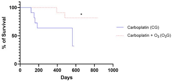 Survival curves of female dogs from the carboplatin group (CG) and carboplatin + O3 group (O3G) after the chemotherapy sessions. The log-rank (Mantel–Cox) statistical test was used to compare the curves, with significance set at p < 0.05, and a significant difference was found (p = 0.0224), represented by the symbol “*”.