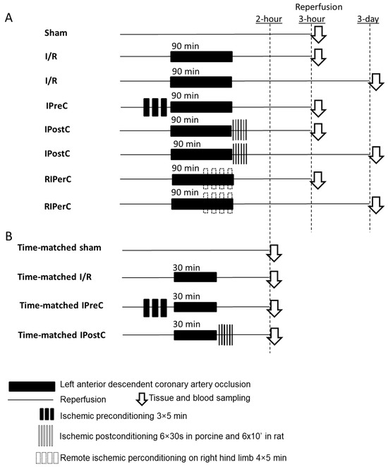 Experimental protocols for animal models of microRNA measurements. Panel (A): Protocols for ischemic conditionings in a clinically relevant closed-chest porcine model of reperfused acute myocardial infarction (for original protocol figure, see Baranyai et al. [20]). Panel (B): Protocols for ischemic conditionings in rat model of reperfused acute myocardial infarction (for original protocol figure, see Varga et al. [19]).