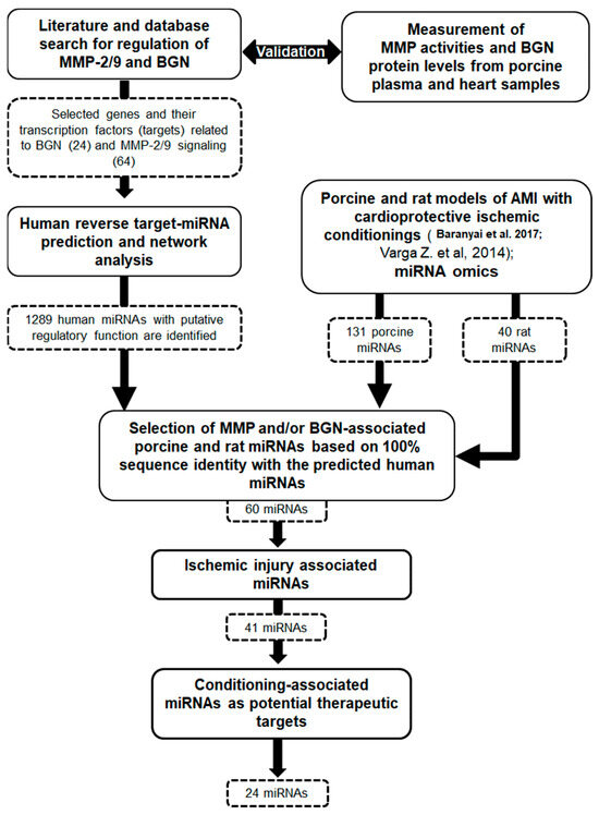 In order to validate the role of miRNAs targeting MMP-2 and -9 enzymes and biglycan in acute myocardial infarction and in different types of conditioning, we have built two reverse prediction-based human miRNA–target interaction networks using genes involved in the regulation of MMPs and BGN as input. As a result of a thorough literature search and querying the TRRUST database for the transcription factors related to the MMP pathway, including the own genes of BGN and the two MMP isoforms and their regulatory factors, we have identified 24 and 64 different signaling molecules for the BGN and the MMP pathways, respectively (Supplementary Table S1). The constructed miRNA–target interaction networks contain 549 miRNAs related to BGN regulation and 1137 miRNAs related to MMP-2 and -9 regulation (Supplementary Tables S2 and S3 and Supplementary Figures S2 and S3). Since there are overlapping miRNAs, the networks ultimately consist altogether of 1289 miRNAs (see flow chart in Figure 2).