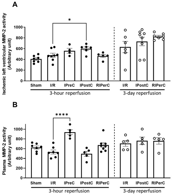 Matrix metalloproteinase-2 activity measured from infarcted left ventricular tissue (Panel (A)) and plasma samples (Panel (B)) of pigs subjected to acute myocardial infarction and ischemic conditioning interventions. Results are expressed as mean ± SEM. Statistical analysis shows the results of one-way ANOVA with Dunnett’s multiple comparisons test with the corresponding control; n = 4–8/group, * p = 0.0468, **** p < 0.0001.