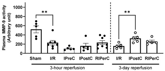 Plasma MMP-9 activity was significantly decreased in ischemic control as compared to the sham-operated animals, while ischemic conditionings did not affect MMP-9 activity at early reperfusion (i.e., 3 h); however, at 3-day of reperfusion, MMP-9 activity was significantly increased after IPostC as compared to the 3-day ischemic control samples (Figure 4).