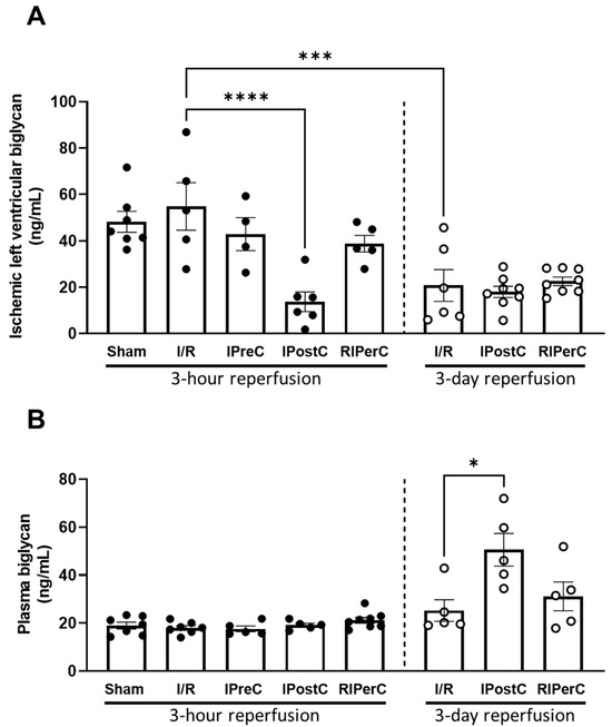 Biglycan concentration measured from infarcted left ventricular tissue (Panel (A)) and plasma samples (Panel (B)) of pigs subjected to acute myocardial infarction and ischemic conditioning interventions. Results are expressed as mean ± SEM. Statistical analysis shows the results of one-way ANOVA with Dunnett’s multiple comparisons test with the corresponding control; n = 4–8/group, * p = 0.0184, *** p = 0.0003, **** p < 0.0001.