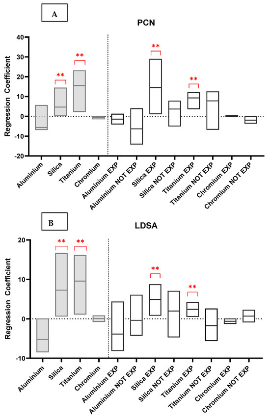 Table 2 and Figure 2 summarize the results of the models of urinary metal and NM exposure (PCN and LDSA). The Silica and Titanium urinary concentrations increased directly and were associated with increased PCN levels (Table 2, part A; coefficient = 4.7, p = 0.05, 95% C.I. 0.08/4.5; coefficient = 15.5, p = 0.02, 95% C.I. 2.2/23.2, respectively) in the whole-sample model. Interestingly, in the models stratified by exposure, the same associations were confirmed, albeit only in the exposed subjects and only for Silica and Titanium (Table 2, part B; coefficient = 14.5, p = 0.03, 95% C.I. 1.1/29.03; coefficient = 9.3 p = 0.04, 95% C.I. 3.6/12.2, respectively). Silica and Titanium (Figure 2) were directly associated with LDSA in the whole-sample model (Table 2, part C; coefficient = 4.5, p = 0.04, 95% C.I. 0.6/16.7; coefficient = 11.4, p = 0.03, 95% C.I. 1.1/16.2, respectively). The same associations were confirmed in the models stratified by exposure (Figure 2), but only in the exposed subjects and only for Silica and Titanium (Table 2, part D; coefficient = 5, p = 0.04, 95% C.I. 0.8/8.8; coefficient = 2.5, p = 0.02, 95% C.I. 0.5/4.2, respectively).