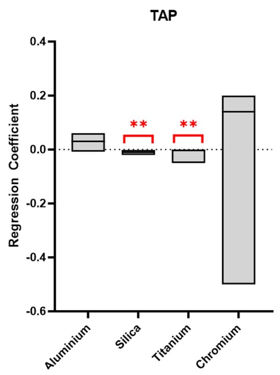 Owing to the small size and the heterogeneity of the sample under study, the models were performed only in the whole sample (Figure 3). The models showed a significant decrease in TAP concentration with increasing urinary Silica and Titanium concentrations (coefficient = −0.7, p = 0.01, 95% C.I. −0.02/−0.002; coefficient = −0–008, p = 0.04, 95% C.I. −0.05/−0.0001, respectively).