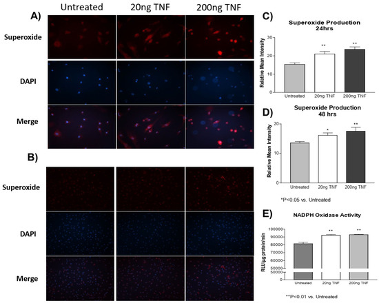 TNF-α treatment increases superoxide production in PASMCs. PASMCs were treated with recombinant TNF-α (rTNF-α) for 24 or 48 h. The cells were then incubated with dihydroethidium (DHE), rinsed, and the nuclear stain DAPI was applied. Cell lysates were also collected and NADPH oxidase activity was measured using a lucigenin assay. (A) Photos showing representative superoxide production (red), nuclear staining (blue), and the merged images at 24 h of treatment (200×). (B) Photos showing representative superoxide production (red), nuclear staining (blue), and the merged images at 48 h of treatment (100×). (C) Quantification of superoxide production in PASMCs at 24 h of treatment. (D) Quantification of superoxide production in PASMCs at 48 h of treatment. (E) NADPH oxidase activity at 24 h of treatment of treatment. n = 3 independent replicates. * p < 0.05 and ** p < 0.01 vs. untreated.