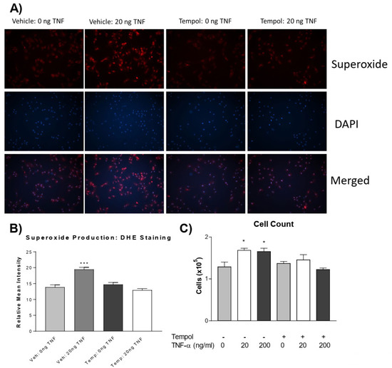 Tempol prevents TNF-α induced superoxide increase and PASMC proliferation. PASMCs were pre-treated with or without tempol (1 mM) for 24 h followed by treatment with rTNF-α for 24 h. (A) Photos from the DHE staining, as described previously, showing the superoxide production (red), nuclear staining (blue), and merged images. (B) Superoxide level. (C) Cell proliferation assessed using an automated cell counter. Tempol was dissolved in DMEM (vehicle) immediately before adding to cell culture dishes. n = 3 independent replicates. * p < 0.05, *** p < 0.001 vs. Vehicle 0 ng. Photos are shown at 100×.