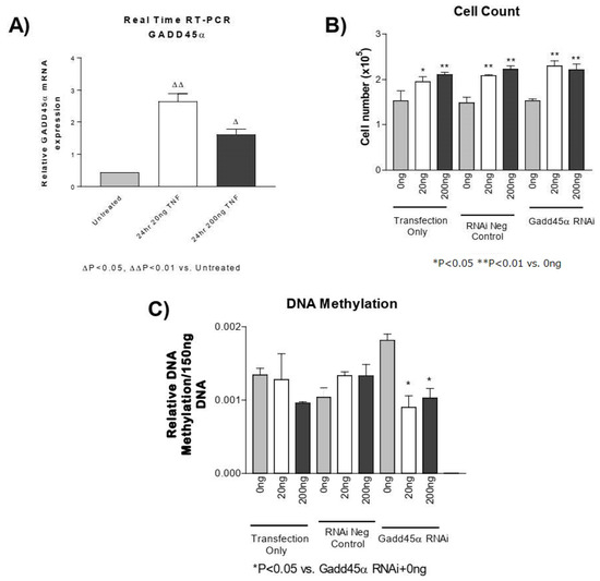 Unlike histone demethylases, which remove methylated lysines on histone tails, there are no known enzymes that are directly responsible for the demethylation of DNA. However, several mechanisms associated with demethylation of DNA involve either base excision or nucleotide excision repair pathways, where a methylated base is removed and replaced with a new and nonmethylated base [59,60,61]. To explore the potential mechanism of TNF-α-induced DNA hypomethylation, we measured the mRNA of several candidate base repair genes associated with the demethylation of DNA (Supplemental Table S1). Among these genes, growth arrest and DNA damage inducible-α (GADD45-α) expression were clearly increased by TNF-α treatment (Figure 5A). GADD45-α belongs to a family of enzymes that are implicated in a variety of cellular processes including cell cycle arrest, DNA repair, and apoptosis in response to physiological and environmental stresses [62]. Furthermore, GADD45-α has been demonstrated to interact with PCNA and promote nucleotide excision repair pathways supporting a role in DNA demethylation [51,52,53]. The established role for GADD45 proteins includes the promotion of DNA repair and tumor suppressor properties but the function of GADD45-α is highly dependent on expression level, cellular localization, and post-translational modifications [62]. Contrasting data suggest that GADD45-α can act as a tumor promoter, as altered expression of GADD45-α protein has also been found in several solid tumors and hematopoietic malignancies involving proliferation [62,63]. In our experiment, the knockdown of GADD45-α using siRNA did not appear to prevent the TNF-α-induced increase in cell proliferation or decrease in DNA methylation. It is possible, then, that the increase in GADD45α in response to TNF-α may not be promoting a decrease in DNA methylation and that it may be a compensatory response intended to promote DNA repair and prevent chromosomal instability. One possible way to address this conclusion that was beyond the scope of this study would be to overexpress GADD45-α in PASMCs treated with TNF-α to determine whether it is in fact a beneficial response.