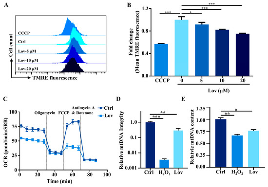 Membrane potential serves as a functional indicator of mitochondrial integrity. To investigate whether the lovastatin impaired the function of mitochondria, we utilized TMRE staining and flow cytometry to detect the mitochondrial membrane potential (MMP) of HCT116 treated with lovastatin (Figure 1A,B). The findings revealed a dose-dependent depolarization of MMP following lovastatin treatment. The primary function of mitochondria is to produce energy, and the most appropriate way to determine the overall mitochondrial energy production efficiency is to measure the mitochondrial oxygen consumption (OCR) [40]. In line with our previous work [17], lovastatin significantly decreased the OCR in HCT116 cells (Figure 1C). To investigate the effect of lovastatin on the integrity of the mitochondria genome, we examined the mtDNA integrity using a PCR-based assay (quantitative long PCR), which is sensitive in measuring mtDNA breaks [39]. As shown in Figure 1D, the exposure of HCT116 cells to H2O2 as the positive control significantly reduced mtDNA integrity, in line with a previous study [41]. As expected, the results demonstrated that the mtDNA integrity of the lovastatin treatment group was significantly lower than that of the control group (Figure 1D). Consistent with this finding, a quantitative PCR (qPCR) analysis revealed that lovastatin significantly decreased the abundance of mtDNA (Figure 1E).