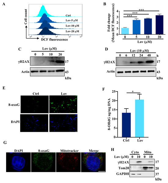 Since mitochondrial dysregulation is closely associated with excessive ROS production [42], we treated HCT116 cells with a serial concentration of lovastatin for 48 h to determine its effect on ROS production. The results showed that lovastatin treatment led to an increase in intracellular ROS accumulation (Figure 2A,B). ROS are one of the oxidants which has modulatory effects on DNA damage response, integrating the DNA damage response, DNA repair, and DNA replication [43]. We next determined whether lovastatin induces DNA damage by measuring the level of γH2AX, a sensitive molecular marker of DNA damage and repair response. After the treatment of the HCT116 cells with increasing concentrations of lovastatin for 48 h, the immunoblotting results showed that lovastatin increased the γH2AX levels dose-dependently (Figure 2C and Figure S1A). Furthermore, the treatment of HCT116 cells with 10 μM lovastatin for 6, 12, 24, and 48 h resulted in a time-dependent increase in γH2AX levels (Figure 2D and Figure S1B). Under oxidative stress, guanine will be oxidized at position 8 to generate 8-hydroxylated guanine species, serving as oxidative DNA damage markers [44]. Among these species, 8-oxoguanine (8-oxoG) and 8-hydroxydeoxyguanosine (8-OHdG) are the common biomarkers of oxidative stress. Following lovastatin treatment, 8-oxoG increased substantially in HCT116 cells as measured by an immunofluorescence method (Figure 2E). Additionally, 8-OHdG content was determined using the ELISA Kit, which demonstrated a significant increase in the statin treatment group, as compared to the control group (Figure 2F). Considering that both mtDNA integrity and mtDNA abundance were significantly reduced in statin-treated cells (Figure 1D,E), we speculated that lovastatin-induced DNA damage could be localized to mitochondria. Immunochemistry staining using MitoTracker Red CMXRos with a confocal laser scanning microscope confirmed that 8-oxoG was localized in mitochondria in lovastatin-treated HCT116 cells (Figure 2G). It has been reported that upon DNA damage, γH2AX accumulated in the cytoplasm [45,46], whereas H2AX was localized in the mitochondria [47]. Hence, we further examined the γH2AX levels in mitochondria using subcellular fractionation isolated by using the Qproteome Mitochondria Isolation Kit. HCT116 cells receiving vehicle and lovastatin treatment were separated into cytoplasmic and mitochondrial fractions, and γH2AX levels were analyzed by immunoblotting using cytoplasmic (GAPDH) and mitochondrial (Tom20) markers to monitor the purity of the fractions. After lovastatin treatment, γH2AX levels increased in both cytoplasmic and mitochondrial fractions, although it was found in the cytoplasm at higher levels (Figure 2H and Figure S1C). Collectively, these results showed that lovastatin treatment leads to the generation of ROS, resulting in DNA damage, including the impairment to mtDNA.
