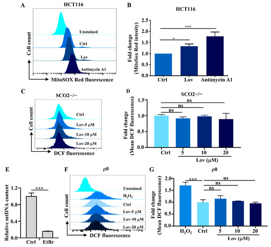 Lovastatin exposure induces mitochondrial ROS generation. (A) HCT116 cells were treated with 10 μM lovastatin for 48 h, or with 20 μM Antimycin A (positive control) for 40 min before staining with MitoSOX red and analyzed by flow cytometry. (B) Quantitative analysis of MitoSOX Red fluorescence intensities of (A). (C) After treatment with a different concentration of lovastatin for 48 h in SCO2−/− cells, the ROS production was assessed by monitoring the changes in the fluorescence intensity of DCF by flow cytometry. (D) Quantification data of DCF fluorescence intensity of (C). (E) Quantitative PCR analysis of mtDNA depletion from HCT116 treated with ethidium bromide (EtBr) over three weeks. (F) After treatment with a different concentration of lovastatin for 48 h in ρ0 HCT116 cells, the ROS production was assessed by monitoring the changes in the fluorescence intensity of DCF by flow cytometry. (G) Quantification data of DCF fluorescence intensity of (F). All data were obtained from at least three independent experiments. * p < 0.05; *** p < 0.01; and ns, no significance.