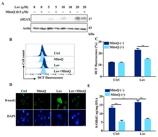 The mitochondrial-targeted ubiquinone, MitoQ, is a lipophilic triphenylphosphonium cation covalently attached to an ubiquinol antioxidant, acting as an effective mitochondrial-targeted ROS scavenger [52]. To assess whether DNA damage induced by lovastatin could be attenuated by MitoQ, we examined the γH2AX levels in HCT116 cells treated with lovastatin at serial concentrations (0, 5, 10, 20 μM) with or without MitoQ. Consistent with the results indicated in Figure 2C, lovastatin induced γH2AX levels in a dose-dependent manner (Figure 4A and Figure S2). However, γH2AX levels were notably reduced in the group treated with both MitoQ and lovastatin, compared to the group treated with lovastatin alone. To further evaluate whether MitoQ could attenuate ROS production in HCT116 cells treated with lovastatin, we measured the ROS levels using DCF staining and proceeded with flow cytometry. Consistent with a previous study [53], MitoQ did not affect ROS production in the control group (Figure 4B,C). However, intracellular ROS production was significantly reduced by MitoQ in lovastatin-treated HCT116 cells (Figure 4B,C), suggesting that lovastatin-induced ROS production primarily originates from the mitochondria. Notably, the immunofluorescence assay demonstrated that the fluorescence level of 8-oxoG was substantially mitigated by MitoQ in the lovastatin-treated group (Figure 4D). In accordance with the reduction of 8-oxoG, we also recorded a decrease in 8-OHdG content in HCT116 cells treated with both MitoQ and lovastatin (Figure 4E). Taken together, these results collectively support the notion that the ROS generation induced by lovastatin stems predominantly from the mitochondria, and the mitochondrial-targeted ROS scavenger MitoQ significantly attenuates lovastatin-induced DNA damage in HCT116 cells.