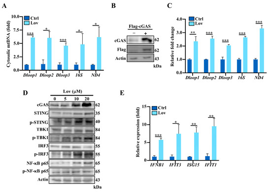 Since mitochondrial stress can trigger the release of mtDNA into the cytosol, we wondered whether the oxidative stress induced by lovastatin could also trigger mtDNA release into the cytosol. To detect cytosolic mtDNA, we performed a qPCR to analyze the relative mtDNA amount in the cytosolic extracts, as previously described [38]. The results revealed a four-to-six-fold increase in specific mtDNA fragments from the D-loop regulatory region, 16S rRNA, and NADH dehydrogenase protein subunit 4 (ND4), indicating the liberation of mtDNA into the cytosol (Figure 5A). Since the accumulation of cytosolic mtDNA could be recognized by the DNA sensor cGAS, and the activation of the cGAS-STING pathway resulted in IRF3 activation and an increase in a type I IFN response [54,55], we ascertained a lovastatin-induced mtDNA leakage into the cytosol and binding to cGAS. Flag-tagged cGAS from HCT116 cells treated with lovastatin was immunoprecipitated, followed by a qPCR for the detection of mtDNA (Figure 5B and Figure S3A). The results showed that, in response to lovastatin treatment, cGAS was bound to mtDNA with evidence of a two-to-three-fold increase of D-loop regulatory region, 16S rRNA, and ND4 (Figure 5C). To further investigate whether the cGAS-STING pathway signaling was activated by lovastatin, we examined the protein expression levels of cGAS, STING, TBK1, and IRF3, as well as their phosphorylated forms. As shown in Figure 5D and Figure S3B, lovastatin significantly increased cGAS expression in a dose-dependent manner. Meanwhile, a significant increase in the levels of phosphorylated STING was also observed (Figure 5D and Figure S3C). STING activation can also trigger downstream nuclear factor kB (NF-κB) [56]. The immunoblotting results confirmed that the phosphorylation level of NF-κB was increased in the lovastatin treatment cells (Figure 5D and Figure S3G). Additionally, it is well known that TBK1 and IRF3 are two important factors of multiple anti-viral signaling pathways, including cytosolic DNA sensor signaling through the cGAS-STING signaling pathway [57]. Consistently, the phosphorylated levels of TBK1 and IRF3 were both dose-dependently increased in lovastatin-treated cells, as demonstrated in Figure 5D and Figure S3E,F. Since phosphorylated IRF3 subsequently dimerizes and translocates to the nucleus and then induces the transcription of type I IFNs [18], we assessed the effect of lovastatin on type I IFNs mRNA expression levels using a qPCR. Compared to the control group, the lovastatin-treated group had five-to-nine-fold elevated transcripts for the type I IFNs gene, including IFNB1, IFIT3, ISG15, and IFIT1. Finally, these findings collectively show that lovastatin triggers the release of mtDNA into the cytosol and activates the cGAS-STING pathway in HCT116 cells.