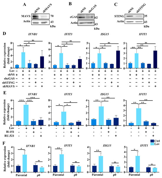 The activation of different signaling modules such as RIG-I/MDA5 (retinoic acid-inducible gene-1, RIG-I; melanoma differentiation-associated protein 5, MDA5), cGAS-STING, and TLR3/4-TRIF (TLR3/4, Toll-like receptors 3/4) results in the production of type I IFNs [18]. To identify the sensor which regulates lovastatin-induced type I IFNs (IFNB1, IFIT3, ISG15, and IFIT1), the conserved signaling adaptors MAVS, cGAS, or STING were knocked down in HCT116 cells, and a Western blot was conducted to confirm gene knockdown efficacy by shRNA (Figure 6A–C and Figure S4). As shown in Figure 6D, the absence of MAVS did not reduce the activation of type I IFNs induced by lovastatin. Instead, the knockdown of cGAS, a sensor of cytosolic DNA, reduced the activation of type I IFNs to baseline (Figure 6D). Once cGAS senses cytosolic DNA, it will in turn activate STING to upregulate the expression of type I IFNs. Consistently, we then observed a significant attenuation of the expression levels of IFNB1, IFIT3, ISG15, and IFIT1 in STING knockdown HCT116 cells treated with lovastatin (Figure 6D). In a complementary approach, we evaluated the gene expressions of lovastatin-induced type I IFNs by blocking the pathway with the pharmacological inhibitor of cGAS (RU.521) and STING (H-151). Indeed, these two inhibitors both prevented the expression of IFNB1, IFIT3, ISG15, and IFIT1 in response to lovastatin treatment (Figure 6E). Since cGAS can respond to double-stranded DNA (dsDNA) of either nuclear or mitochondrial origin [58,59], to ascertain the source of DNA activating cGAS in response to lovastatin treatment, we next examined whether type I IFNs expression could be influenced in ρ0 cells. The results demonstrated that unlike in the parental cells, the expression levels of IFNB1, IFIT3, ISG15, and IFIT1 were not increased in ρ0 cells treated with lovastatin (Figure 6F). As shown in Figure 4C, cytosolic mtDNA bound to cGAS after lovastatin treatment in HCT116 cells. Collectively, we concluded that lovastatin caused mtDNA to be released to the cytosol by promoting cGAS/STING activation.