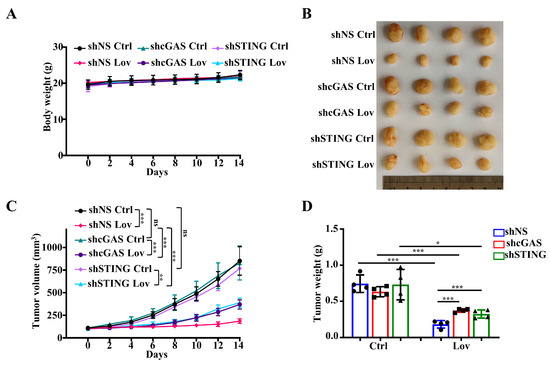 Finally, to extend the in vitro results, the antitumor effect of lovastatin was measured in STING or cGAS knockdown HCT116 tumor-bearing nude mice. As shown in Figure 8A, there was no significant difference in body weight among all mice in each treatment group. Consistent with previous studies [60], lovastatin treatment significantly reduced the tumor volume and weight in shNS HCT116-bearing mice compared to the control group (Figure 8B–D). The knockdown of STING or cGAS did not affect the tumor volume and tumor weight in the control group (Figure 8B–D), which is consistent with a previous study [61]. Notably, the antitumor effect of lovastatin was partially attenuated in STING knockdown HCT116 tumor-bearing mice, as evidenced by a moderate but not complete reversal of the antitumor effect in terms of tumor volume and weight (Figure 8B–D). Accordingly, we also observed the same results in cGAS knockdown HCT116 tumor-bearing mice. Overall, these in vitro and in vivo data show that the cGAS/STING pathway is involved in the process of apoptosis, and inhibition of this pathway partially reduces the cytotoxicity of lovastatin in HCT116 cells in vitro and in vivo.