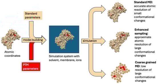 Essential steps in a molecular dynamics simulation workflow. Knowledge of an initial molecular structure is combined with established simulation parameters and—frequently—bespoke additional parameters to represent the PTM to produce a computational “system” that also represents the biologically relevant environment. From there, a variety of methods of molecular dynamics simulations may be employed—see text for details.