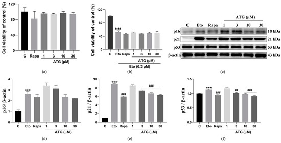 To distinguish whether ATG belongs to which category of senotherapeutics, senolytics or senomorphics. We first examined the effect of ATG on NIH/3T3 cells viability using MTT assay. As shown in Figure 2a,b, ATG had no significant effect on cell viability in the range of 1–30 µM compared to control. For senescent cells induced by 0.3 µM Eto for 2d, ATG also had no significant effect on the viability of senescent cells compared with the Eto group. It has been reported that Rapa acts as senomorphics rather than senolytics [34], which is also consistent with our results. The results indicate that ATG did not specifically induce apoptosis in senescent cells, suggesting that it may be a molecule belonging to senomorphics. At the same time, we used Western blot to analyze the effect of ATG on the expression levels of p16, p21 and p53, which are related to cell senescence or cell cycle arrest in cells [35]. In ATG-treated Eto-induced NIH/3T3 cells (Figure 2c–f and Supplementary Figure S3), we observed a decrease in p21 (p < 0.001, p < 0.001, and p < 0.001) and p53 (p < 0.01, p < 0.001, and p < 0.001), but no significant difference in p16 expression level.